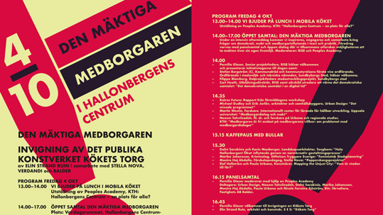 Under dagen hålls seminariet Den Mäktiga Medborgaren med föreläsningar och workshops kring demokrati, makt och medborgarinflytande. Den Mäktiga Medborgaren är ett samarbete mellan Balder, Kairos Future, Urban Design, RISE och Marabouparken konsthall....