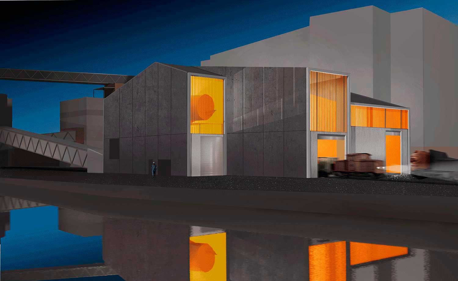 This building is a part of Värtaverkets new biofuel cogeneration plant. In this building wood chips are transferred from boat or train to an underground fuel depot. The shape of the building with its closed ends and open sides accentuate the movement of the trains and trucks that travel through the building.