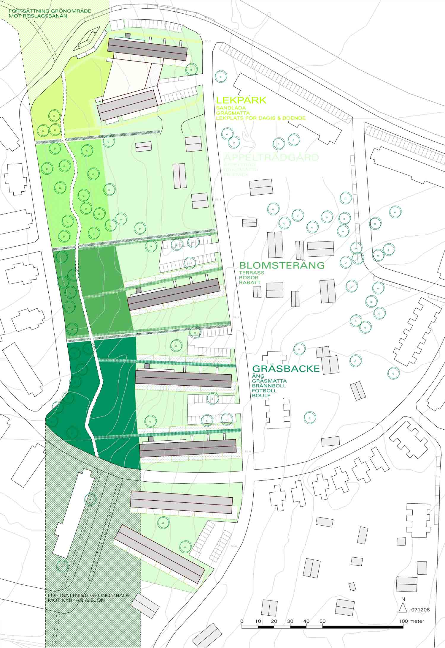 We developed a site plan and a new housing development to be placed along the road, Åbyholmsvägen in Vallentuna. The buildings are placed perpendicular to the slope of the site, beginning at the road and stepping up towards a park. The proposal includes approximately 90 apartments and a pre-school and was selected for implementation by the municipality.