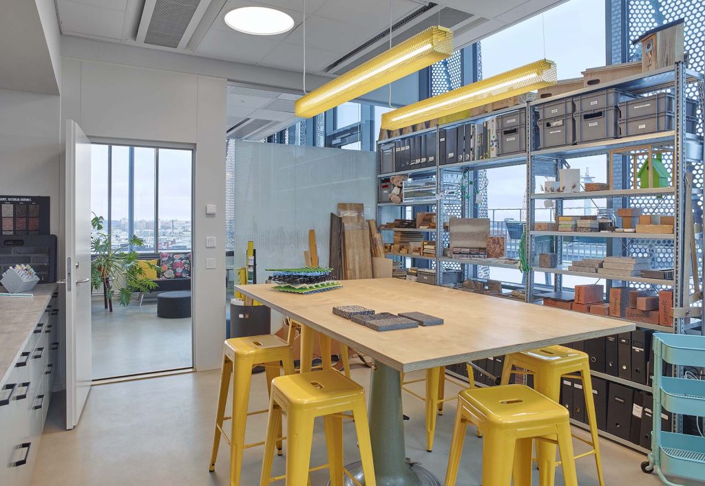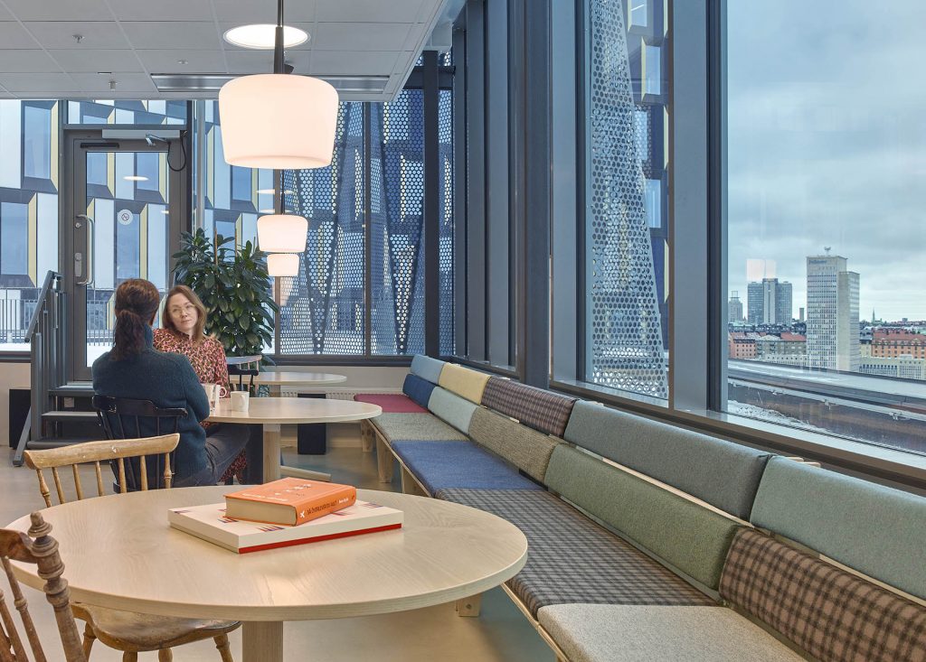 – Ett viktigt önskemål från Funkia var att så mycket som möjligt av inredningen från deras gamla kontor skulle gå att återbruka i det nya. De flesta av möblerna fick därför följa med och många armaturer har byggts om för att bättre passa de nya lokalerna i stället för att köpa nya. Några element är platsbyggda, såsom soffan av resttyger i pentryt och bokhyllan i biblioteket. En rolig detalj som blivit tydlig nu i efterhand är att soffans färger omedvetet matchar färgskalan av Stockholms skyline utanför fönstret, fortsätter Lotten Wahledow, inredningsarkitekt på Urban Design.