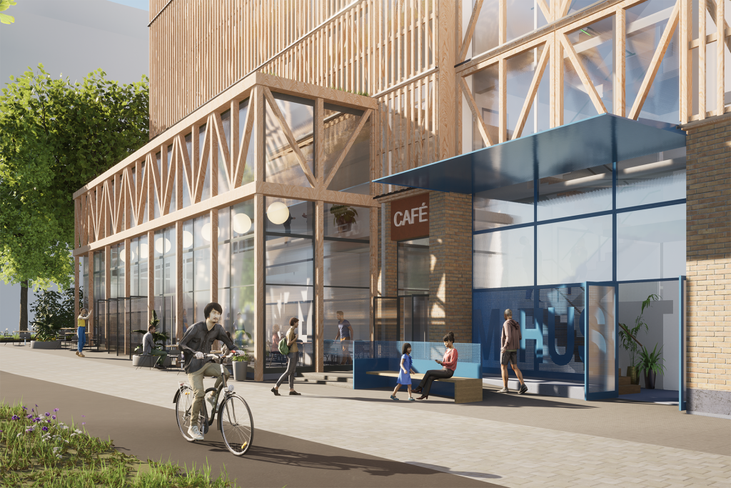 — Byggnadens utformning är indelad i tre delar, en förhöjd sockelvåning, ett antal ovanliggande våningar samt en indragen takvåning. Sockelvåningen är klädd i tegel som är vald för att huset ska åldras vackert och därmed bidra till att byggnaden förhoppningsvis får stå kvar länge. Merparten av fasaden är sedan täckt av en träpanel med smala träribbor. Tanken är att gestaltningen ska föra tankarna till en träask som har trätts på en tegelbox, säger Livia Winkler, arkitekt på Urban Design.