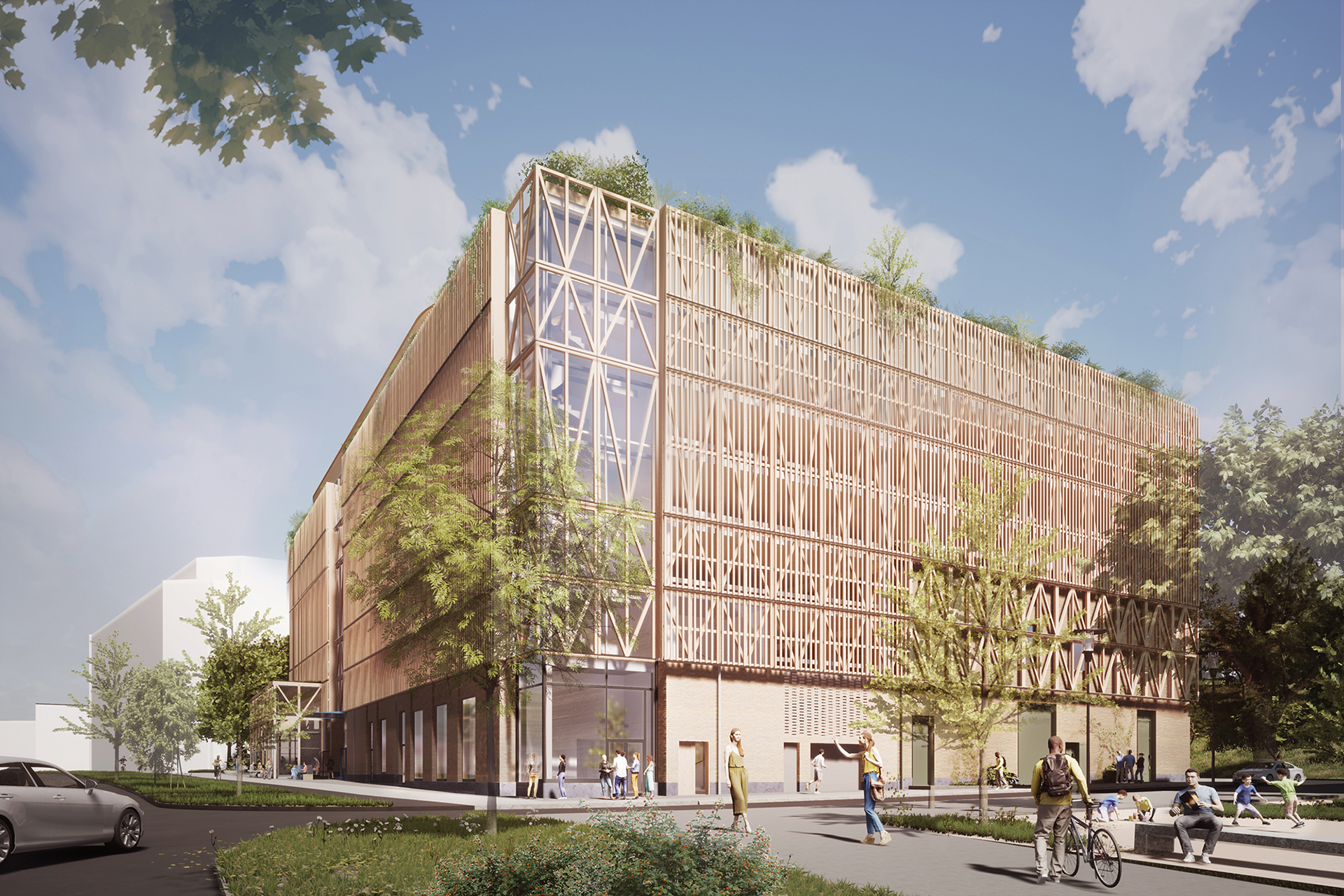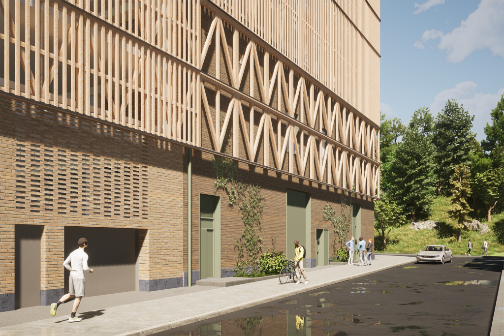 — Byggnadens utformning är indelad i tre delar, en förhöjd sockelvåning, ett antal ovanliggande våningar samt en indragen takvåning. Sockelvåningen är klädd i tegel som är vald för att huset ska åldras vackert och därmed bidra till att byggnaden förhoppningsvis får stå kvar länge. Merparten av fasaden är sedan täckt av en träpanel med smala träribbor. Tanken är att gestaltningen ska föra tankarna till en träask som har trätts på en tegelbox, säger Livia Winkler, arkitekt på Urban Design.