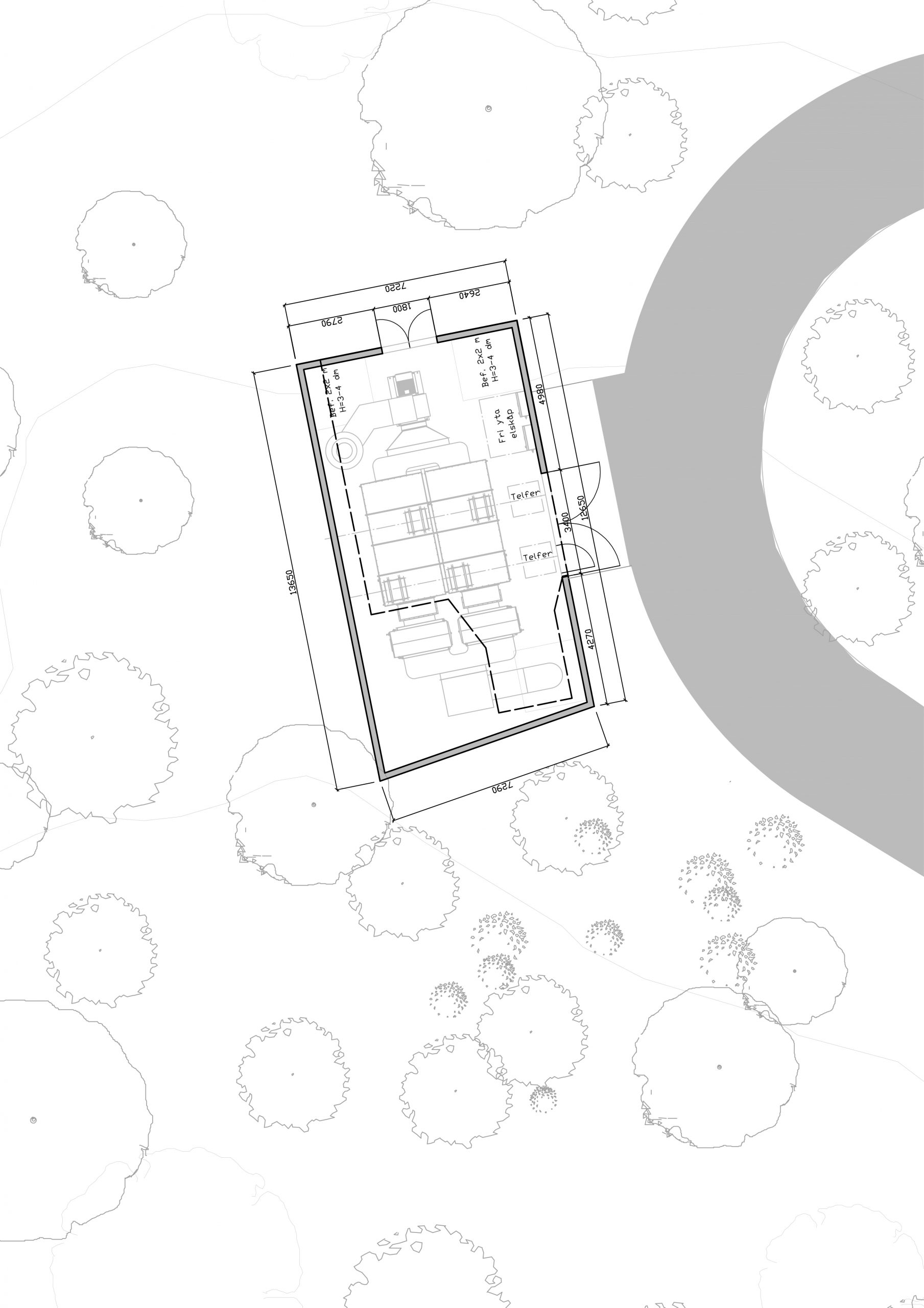 Byggnaden fungerar som ett skydd för en filteranläggning som filtrerar bort dålig lukt från en avloppsledning vilken leder till Käppalaförbundets reningsverk. Byggnaden skulle smälta in i landskapet, samt vara så gott som underhållsfri och klottersäker. Vi föreslog att den enkla stålkonstruktionen skulle kläs på sidorna med ett gabionsystem – stålkorgar fyllda med stenar. Taket, klätt i sedum, blir en förlängning av den omgivande ängen.