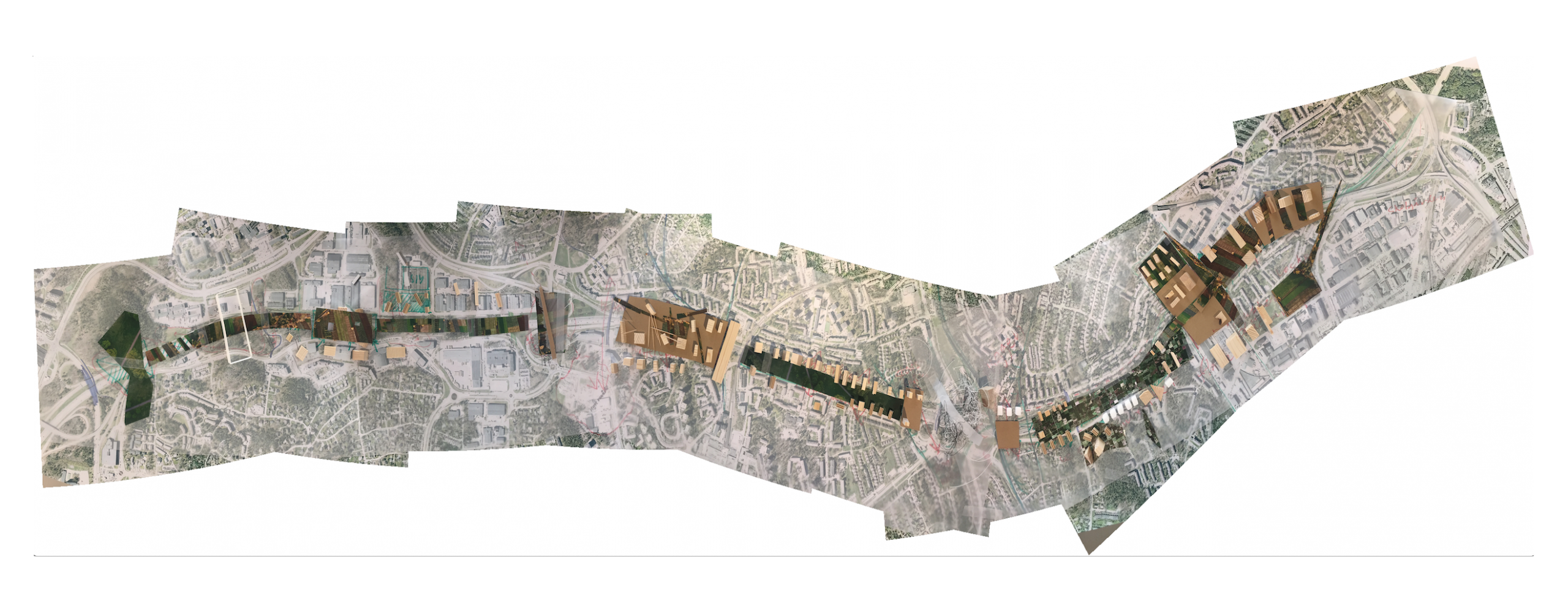 I våra undersökningar av stadens periferi och de möjligheter framtiden rymmer tog vi oss an E4:an från Kungens Kurva till Liljeholmen. Hela kontoret rekognoscerade olika delar av vägen och studerade möjligheter att länka de olika sidorna samt minska påverkan av bilarnas framfart. Resultatet blev en mängd insikter som vi samlade i en 4-meter lång skissmodell. Projektet är en del i Urban Designs interna utvecklings- och forskningslab.