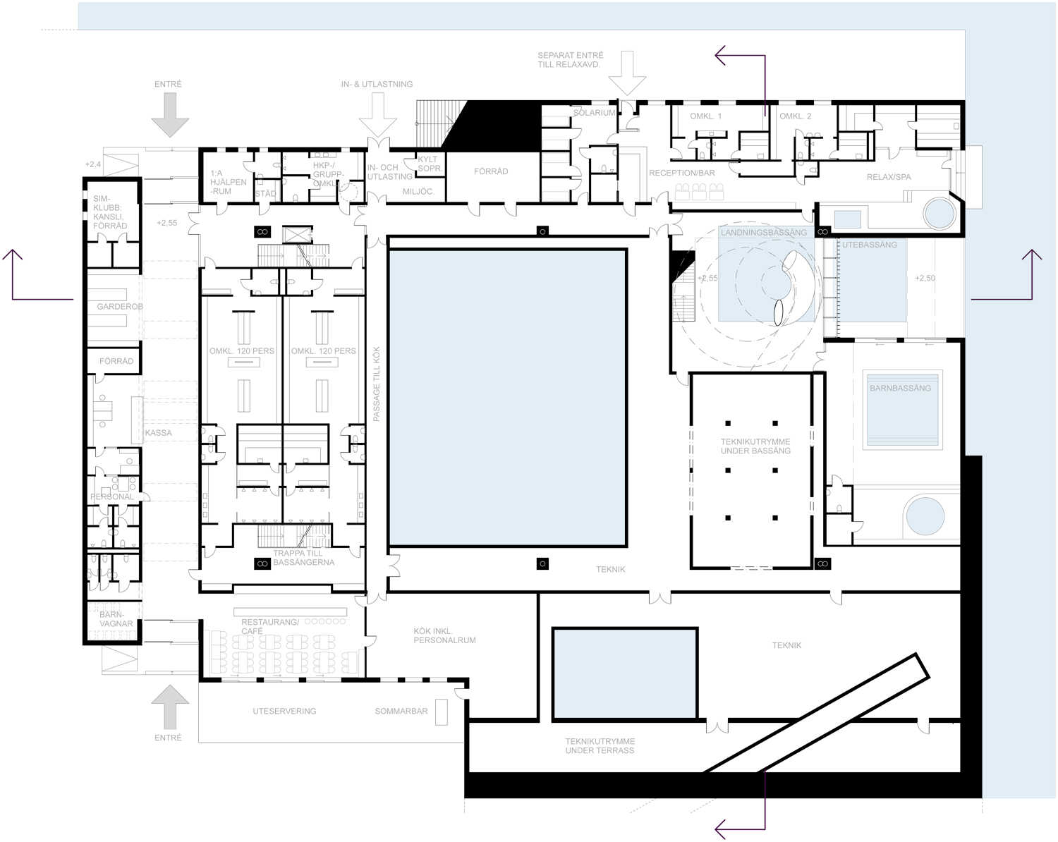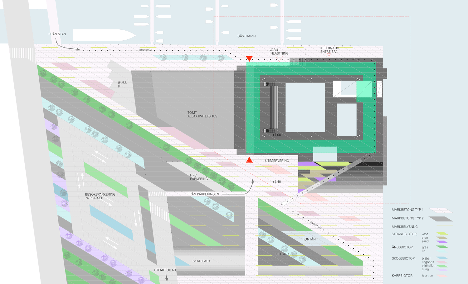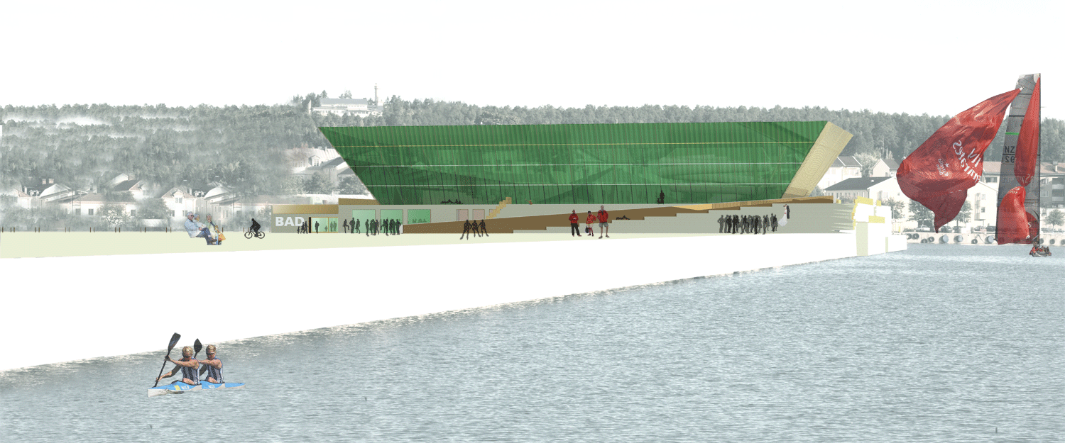 Förslaget Vågskål är ett skålformat rum som vilar på en platå som trappar ner i havet. Bassängerna sänks ner i platån och omges av en grönskimrande glaskropp.