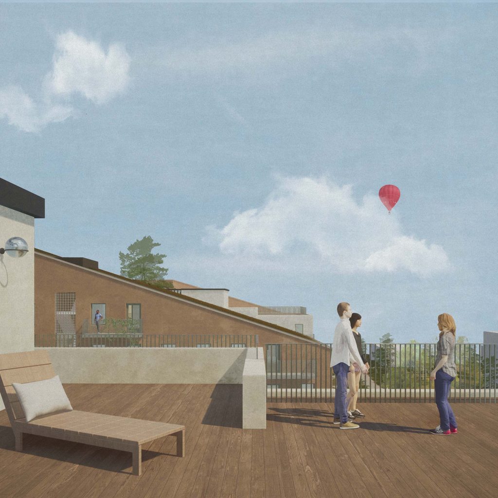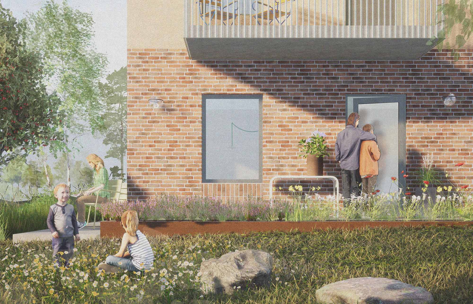 – Vi har försökt att skapa en annan typ av kvarter än det vanliga stadskvarteret. Ett stort fokus har legat på kvarterens bottenvåningar och hur de landar i slänten, mot parken och mot gatan. Det har varit viktigt att det ska kännas attraktivt att bo på bottenvåningen och därför har vi valt att göra dessa uteplatser stora, med kvalitativa material och med möjlighet till att odla. Att de boende vistas på sina uteplatser bidrar dessutom till en mer levande gata och tryggare park, säger Livia Winkler, arkitekt på Urban Design.
